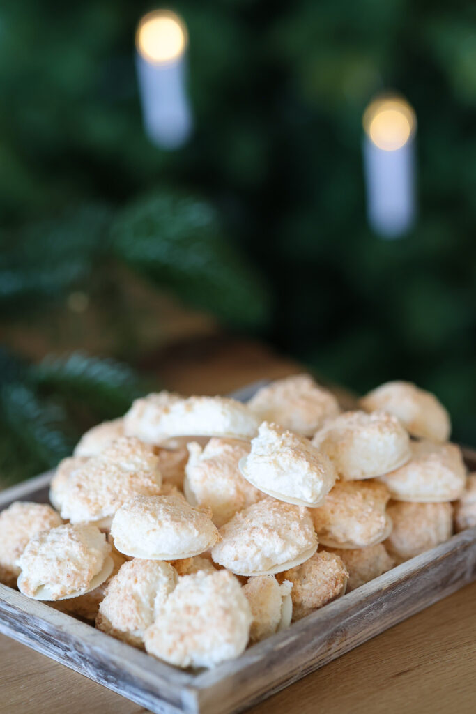 Coconut macaroons are among the few traditional Christmas cookies made without flour. This not only gives them their wonderfully moist texture, but also makes them suitable for a variety of dietary preferences. The combination of fluffy egg whites and shredded coconut creates a light, airy consistency that is very different from crumbly cookies like butter cookies or spritz cookies. It’s exactly this unique texture that makes coconut macaroons so popular. When I was a child, we always baked them together with my grandmother, and they were an absolute must in our Christmas cookie box.