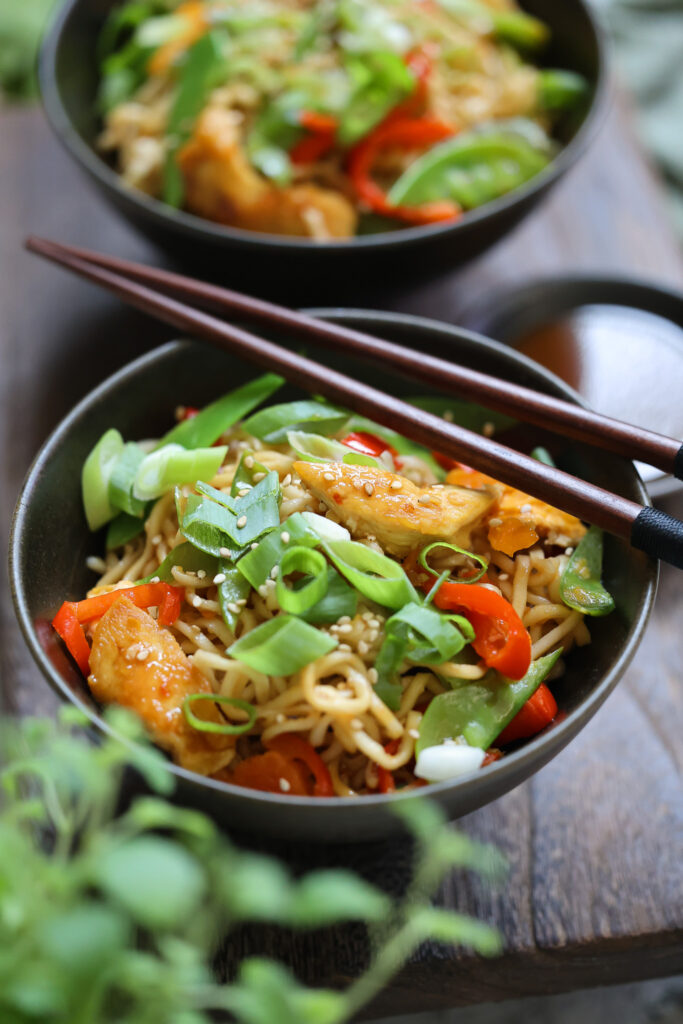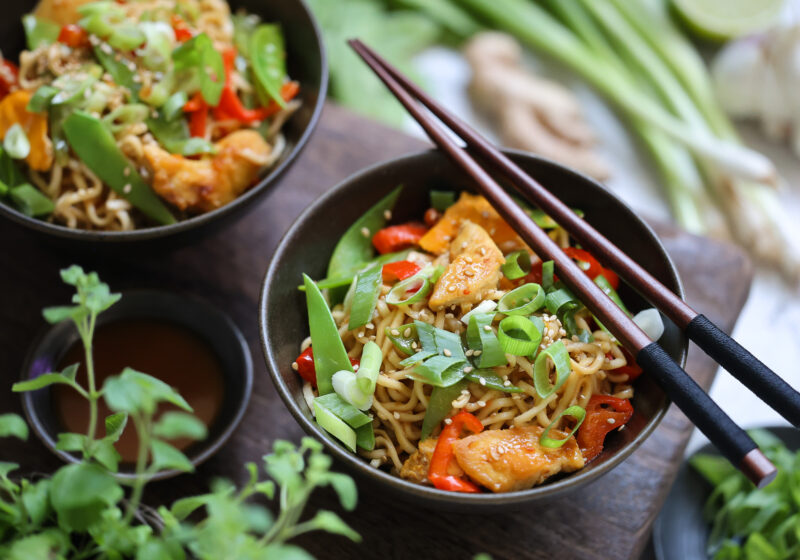 If you like it spicier, you can stir in some chili oil or sambal oelek. For an extra creamy sauce, a teaspoon of peanut butter works beautifully. The vegetables can also be easily swapped: broccoli, carrots, or pak choi are great alternatives. For a vegetarian version, simply replace the chicken with pan-fried tofu.