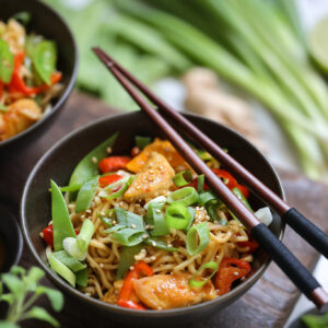 Wenn ihr es schärfer mögt, könnt ihr Chiliöl oder Sambal Oelek unterrühren. Für eine besonders cremige Soße passt ein Teelöffel Erdnussbutter hervorragend. Auch beim Gemüse lässt sich das Rezept leicht abwandeln: Brokkoli, Möhren oder Pak Choi passen genauso gut. Wer vegetarisch kochen möchte, ersetzt das Hühnchen einfach durch gebratenen Tofu.