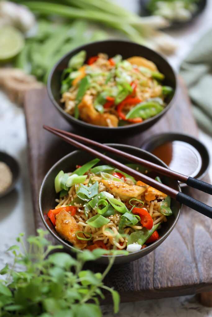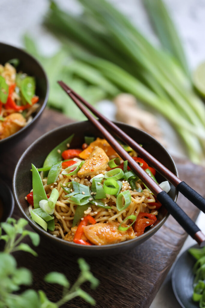 Dieses Rezept für gebratene Nudeln mit Hühnchen ist bewusst unkompliziert gehalten. Ihr braucht keine außergewöhnlichen Zutaten und keinen Wok – eine große Pfanne reicht völlig aus. In weniger als 30 Minuten steht das Essen auf dem Tisch und ihr könnt genießen.