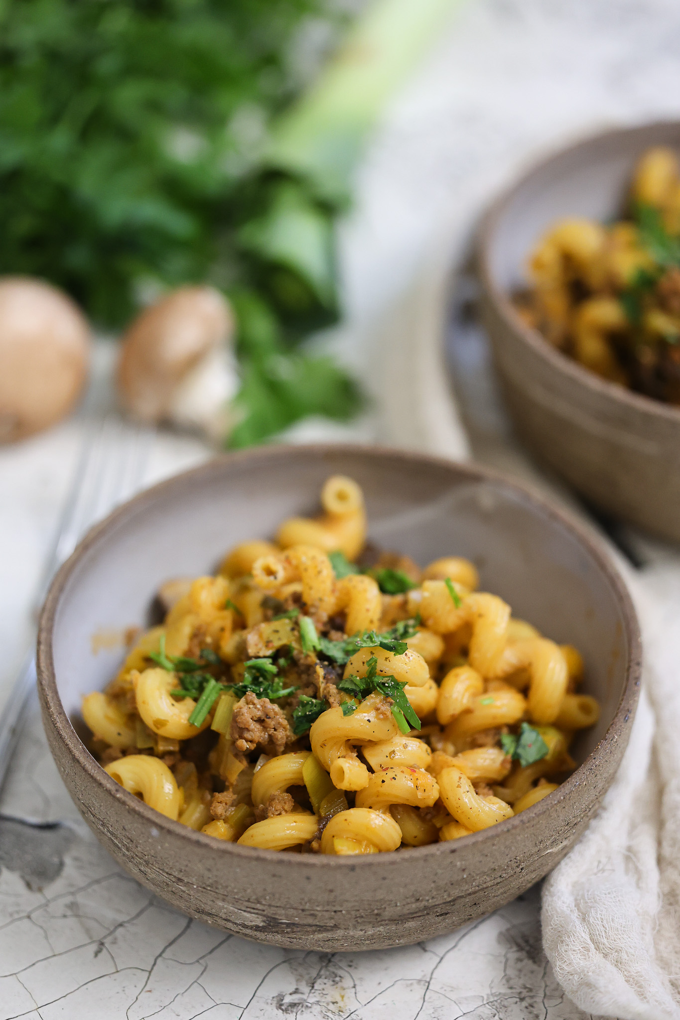 Hackfleischpfanne mit Pasta, Pilzen & Lauch