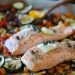 In der Zwischenzeit die Lachsfilets kalt abspülen, trocken tupfen und mit Salz, Pfeffer sowie etwas Zitronensaft würzen. Die Lachsfilets auf das vorgegarte Gemüse legen und alles zusammen weitere 12-15 Minuten im Ofen garen, bis der Lachs zart und das Gemüse leicht gebräunt ist. Das Gericht aus dem Ofen nehmen und nach Belieben mit frischem Zitronensaft beträufeln und servieren.